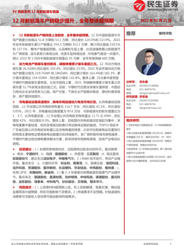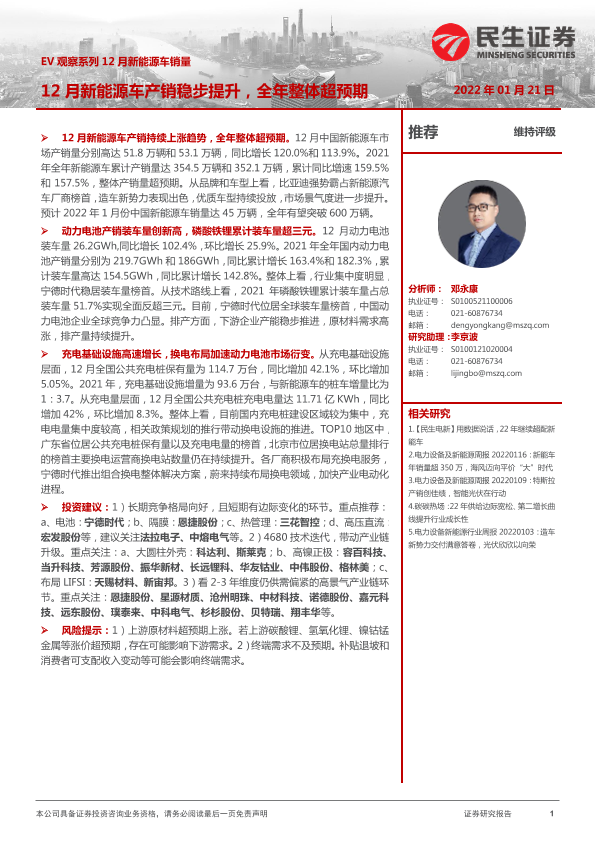 【民生证券】【20220121】12月新能源车销量:12月新能源车产销稳步提升,全年整体超预期-20页