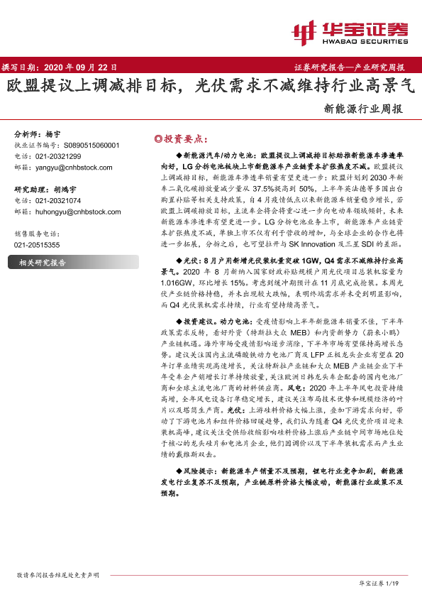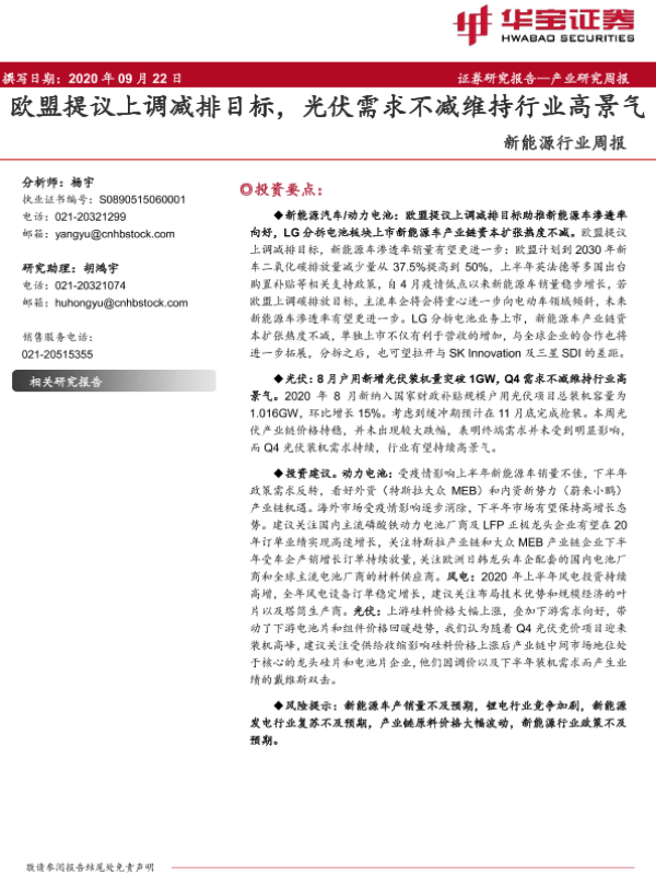 【华宝证券】【20200922】新能源行业周报:欧盟提议上调减排目标,光伏需求不减维持行业高景气-19页