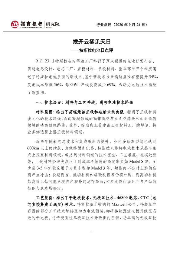 【招商银行】【20200924】拨开云雾见天日——特斯拉电池日点评-3页
