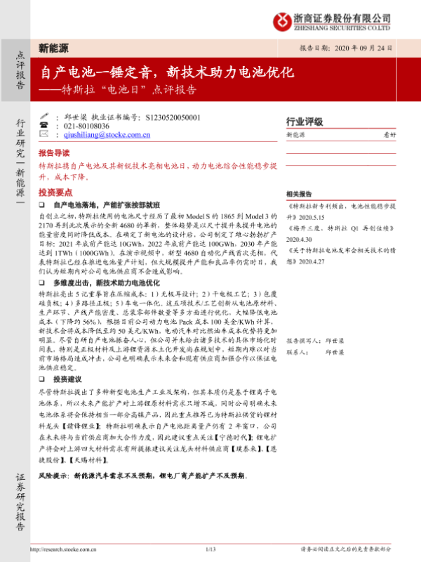 【浙商证券】【20200924】特斯拉“电池日”点评报告:自产电池一锤定音,新技术助力电池优化-13页