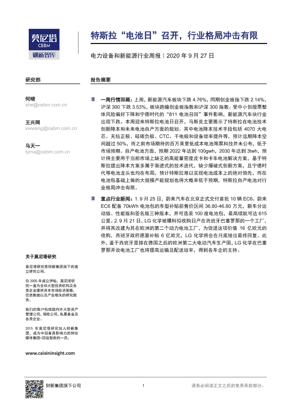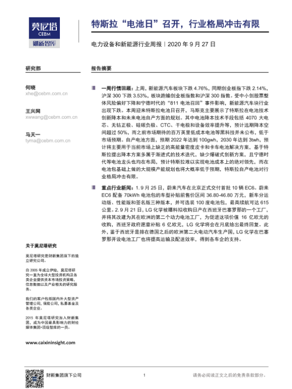 【莫尼塔研究】【20200927】电力设备和新能源行业周报:特斯拉“电池日”召开,行业格局冲击有限-7页