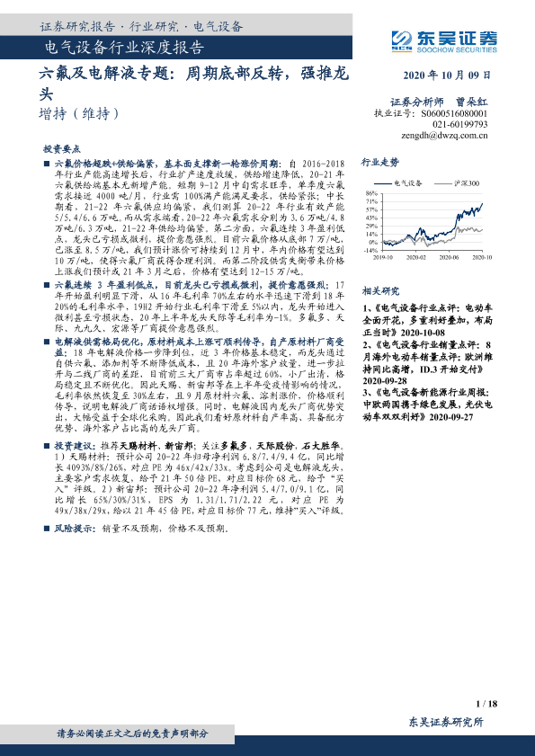 【东吴证券】【20201009】电气设备行业深度报告:六氟及电解液专题:周期底部反转,强推龙头-18页