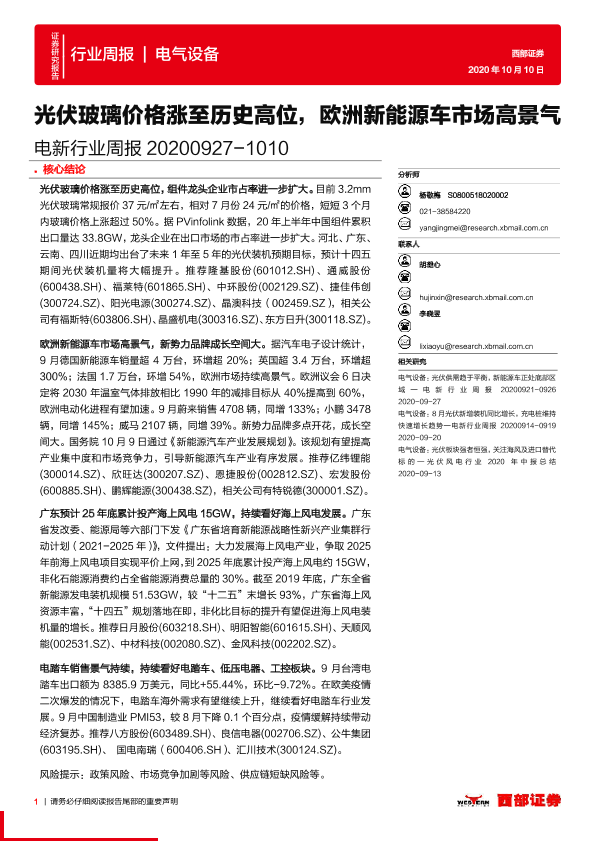 【西部证券】【20201010】电新行业周报:光伏玻璃价格涨至历史高位,欧洲新能源车市场高景气-12页