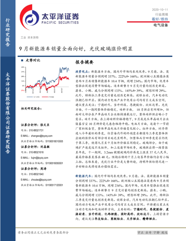 【太平洋证券】【20201011】20201011-太平洋-电气设备行业周报:9月新能源车销量全面向好,光伏玻璃涨价明显-17页