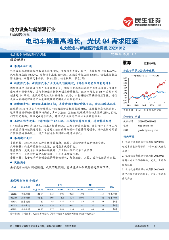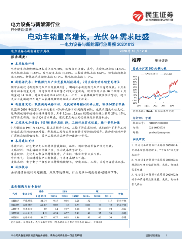 【民生证券】【20201012】电力设备与新能源行业周报:电动车销量高增长,光伏Q4需求旺盛-16页