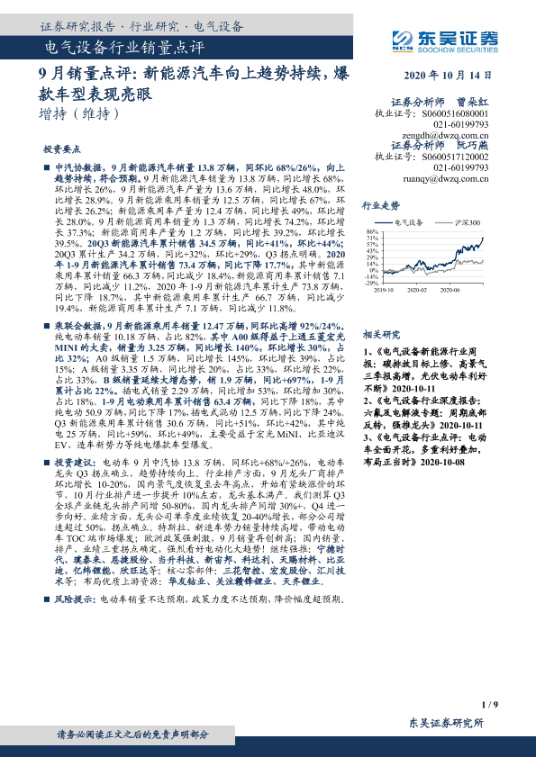 【东吴证券】【20201014】电气设备行业9月销量点评:新能源汽车向上趋势持续,爆款车型表现亮眼-9页