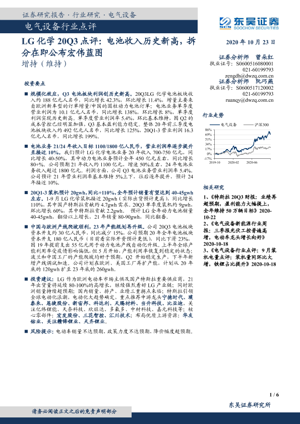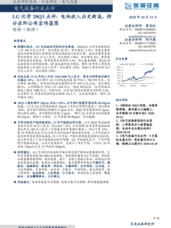 【东吴证券】【20201023】电气设备行业点评:LG化学20Q3点评:电池收入历史新高水平,拆分在即公布宏伟蓝图-6页