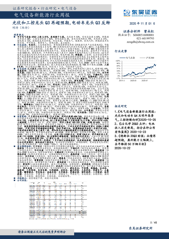 【东吴证券】【20201101】电气设备新能源行业周报:光伏和工控龙头再超预期,电动车龙头Q3反转-41页