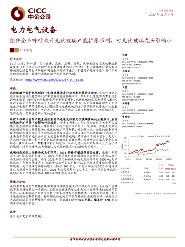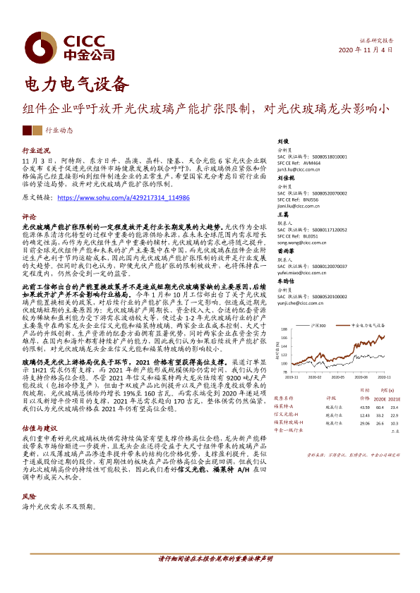 【中金公司】【20201104】电力电气设备行业动态:组件企业呼吁放开光伏玻璃产能扩张限制,对光伏玻璃龙头影响小-5页