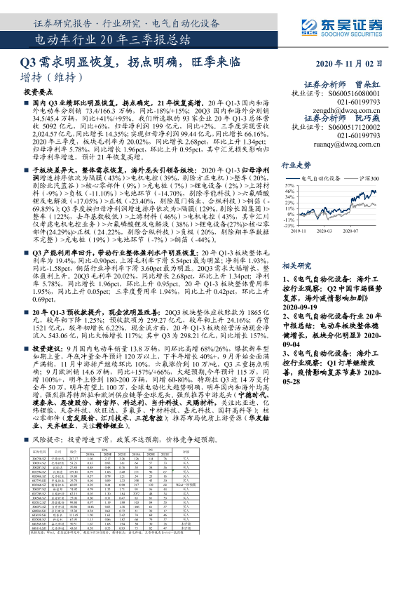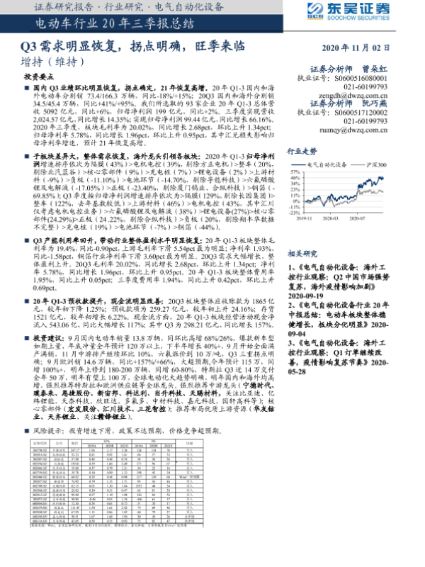 【东吴证券】【20201102】电动车行业20年三季报总结:电动车板块整体稳健增长,板块分化明显-33页