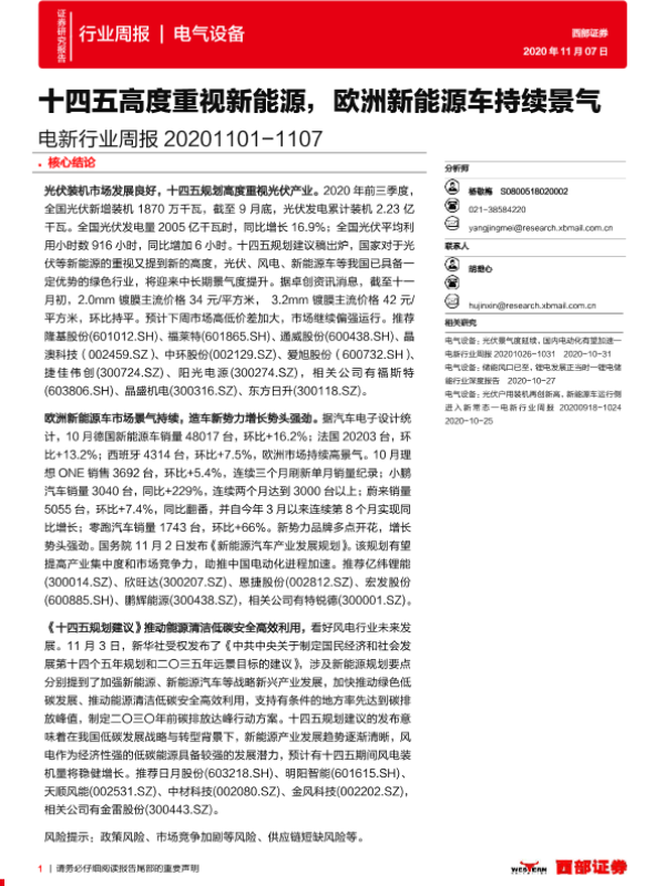 【西部证券】【20201107】20201107-西部证券-电新行业周报:十四五高度重视新能源,欧洲新能源车持续景气-11页
