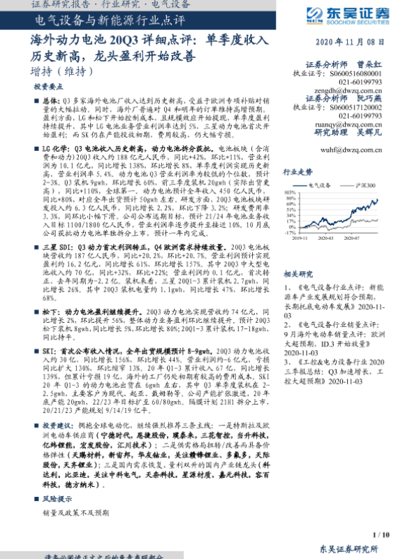 【东吴证券】【20201108】海外动力电池20Q3详细点评:单季度收入历史新高,龙头盈利开始改善-10页