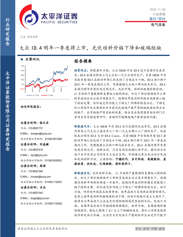 【太平洋证券】【20201108】电气设备行业周报:大众ID.4明年一季度将上市,光伏硅料价格下降和玻璃短缺-16页