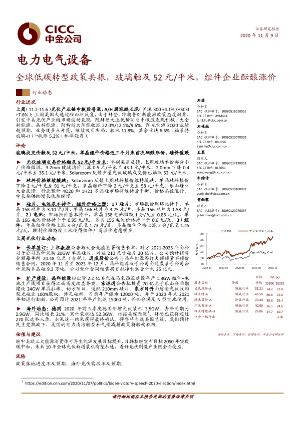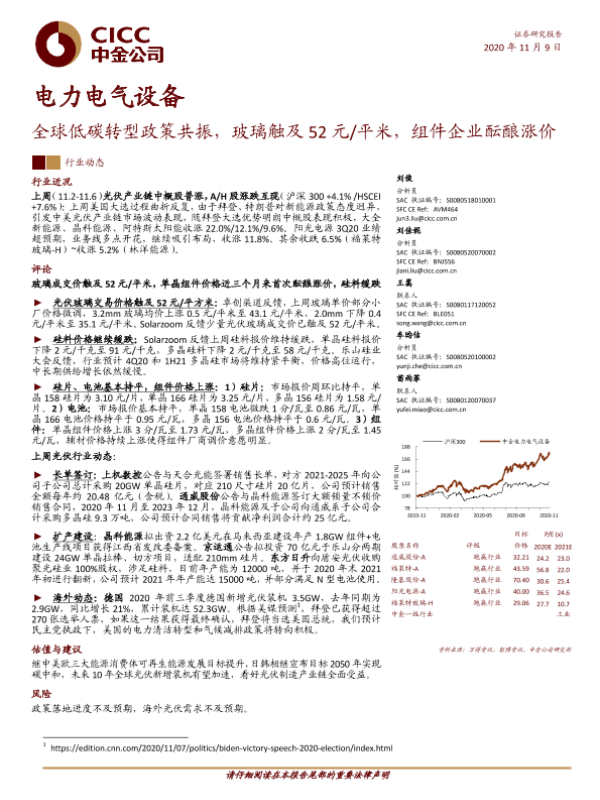 【中金公司】【20201109】电力电气设备行业动态:全球低碳转型政策共振,玻璃触及52元/平米,组件企业酝酿涨价-7页