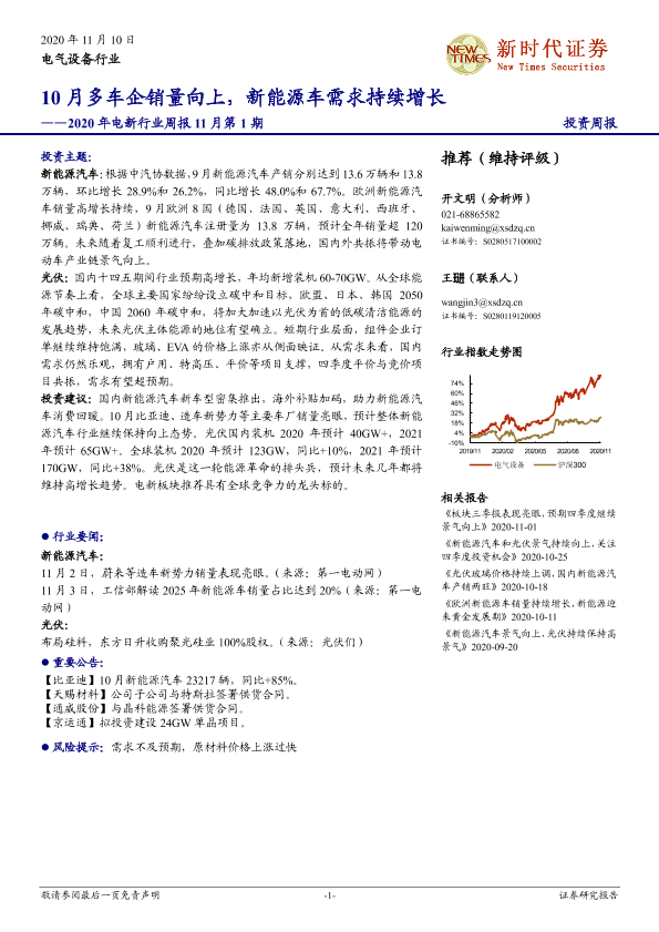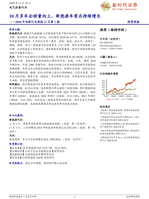 【新时代证券】【20201110】2020年电新行业周报11月第1期:10月多车企销量向上,新能源车需求持续增长-13页