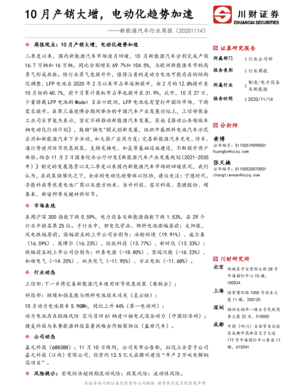 【川财证券】【20201114】20201114-川财证券-新能源汽车行业周报:10月产销大增,电动化趋势加速-18页
