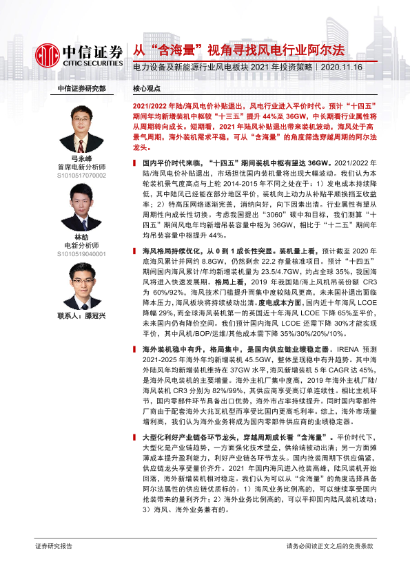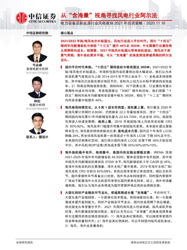 【中信证券】【20201116】电力设备及新能源行业风电板块2021年投资策略:从“含海量“视角寻找风电行业阿尔法-19页