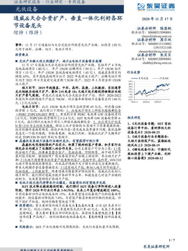 【东吴证券】【20201117】光伏设备:通威&天合合资扩产,垂直一体化利好各环节设备龙头-7页