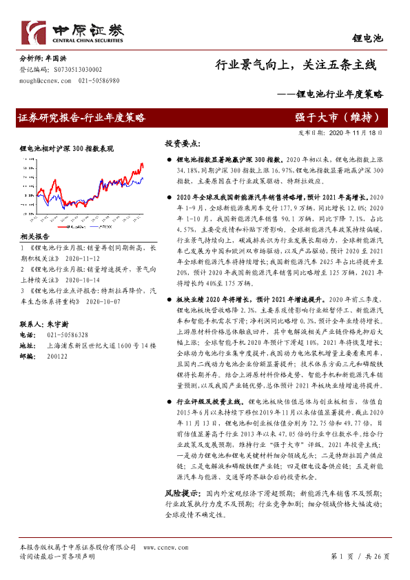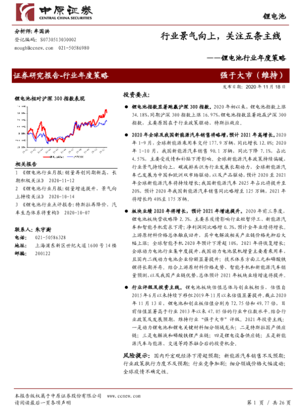 【中原证券】【20201118】锂电池行业年度策略:行业景气向上,关注五条主线-26页