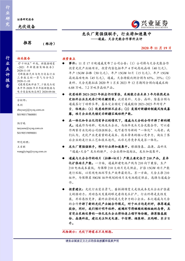 【兴业证券】【20201119】光伏设备:通威、天合光能合作事件点评-龙头厂商强强联手,行业将加速集中-5页