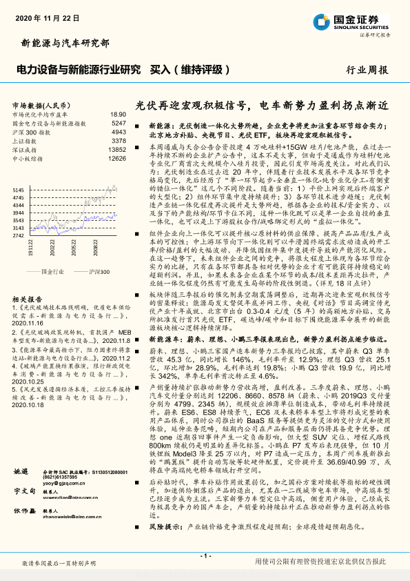 【国金证券】【20201122】电力设备与新能源行业周报:光伏再迎宏观积极信号,电车新势力盈利拐点渐近-4页