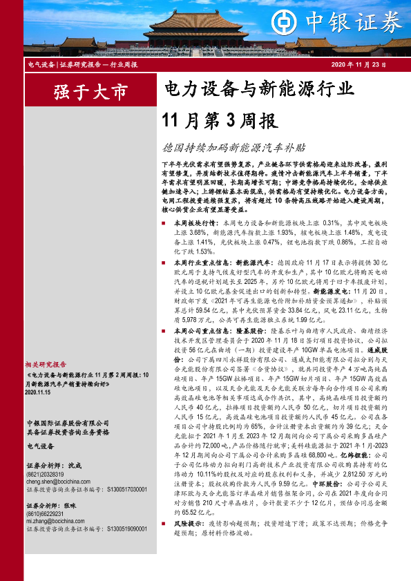 【中银证券】【20201123】电力设备与新能源行业11月第3周报:德国持续加码新能源汽车补贴-17页