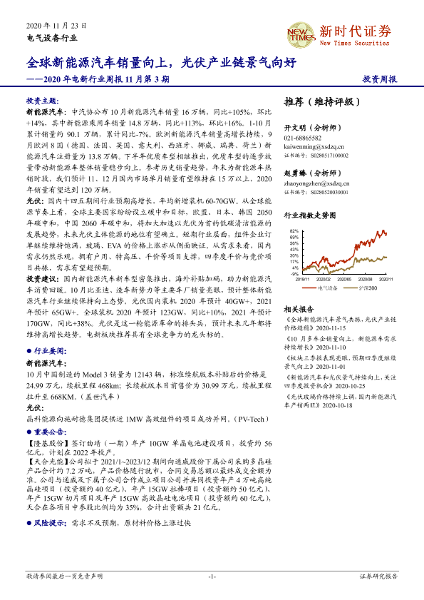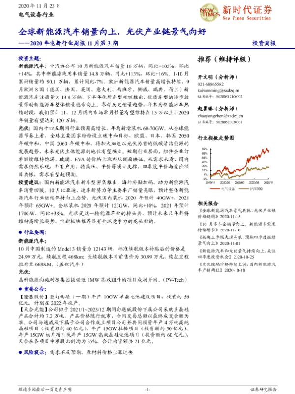 【新时代证券】【20201123】2020年电新行业周报11月第3期:全球新能源汽车销量向上,光伏产业链景气向好-13页
