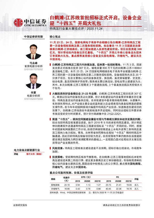 【中信证券】【20201124】特高压行业重大事项点评:白鹤滩-江苏线首批招标正式开启,设备企业迎“十四五“开局大礼包-2页