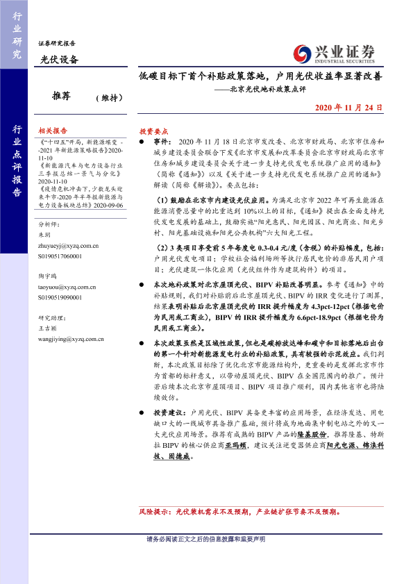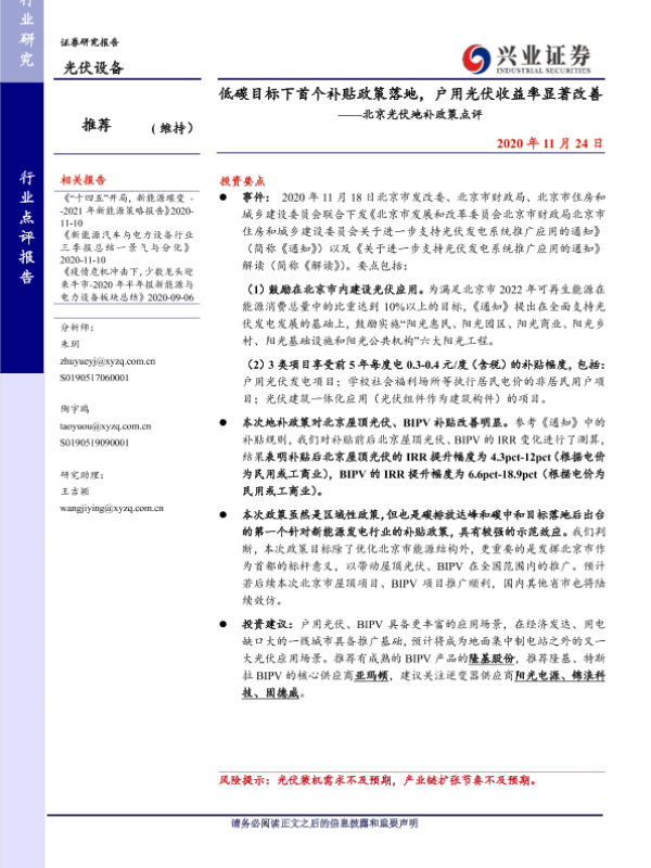 【兴业证券】【20201124】低碳目标下首个补贴政策落地,户用光伏收益率显著改善——北京光伏地补政策点评-6页