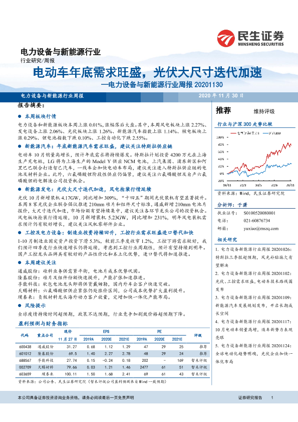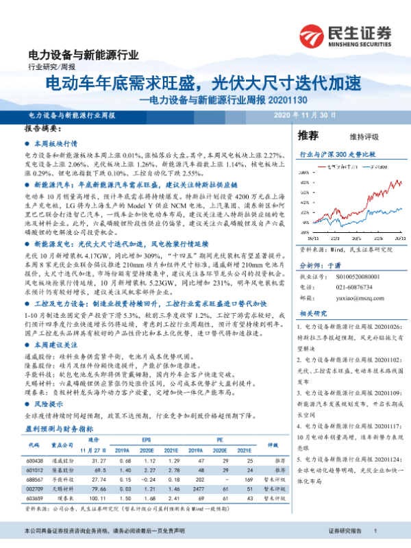 【民生证券】【20201130】电力设备与新能源行业周报:电动车年底需求旺盛,光伏大尺寸迭代加速-18页