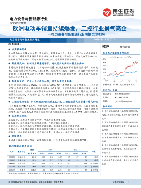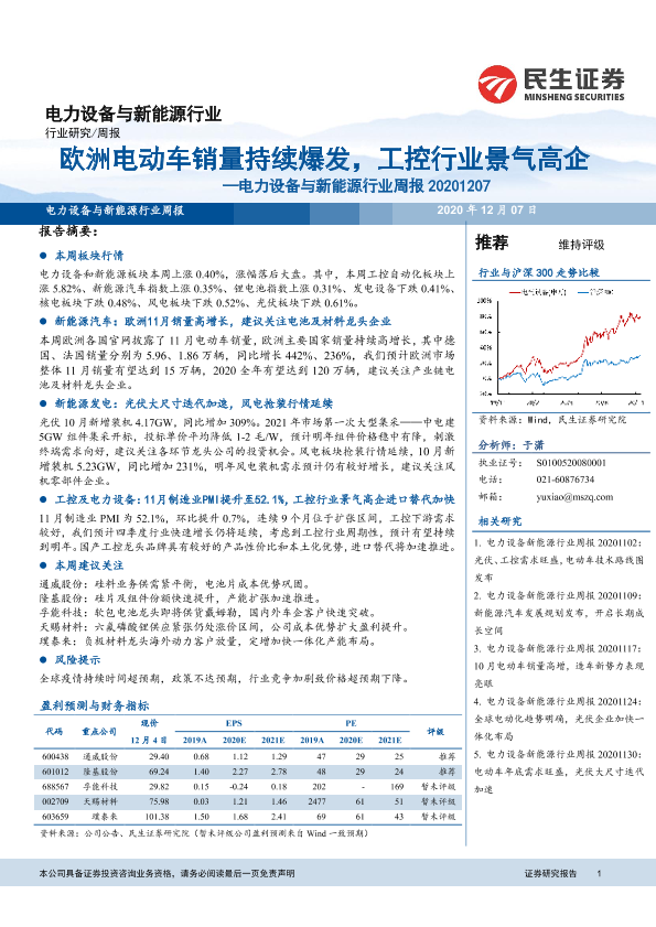 【民生证券】【20201207】电力设备与新能源行业周报:欧洲电动车销量持续爆发,工控行业景气高企-17页