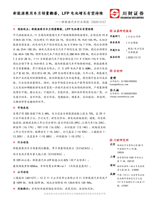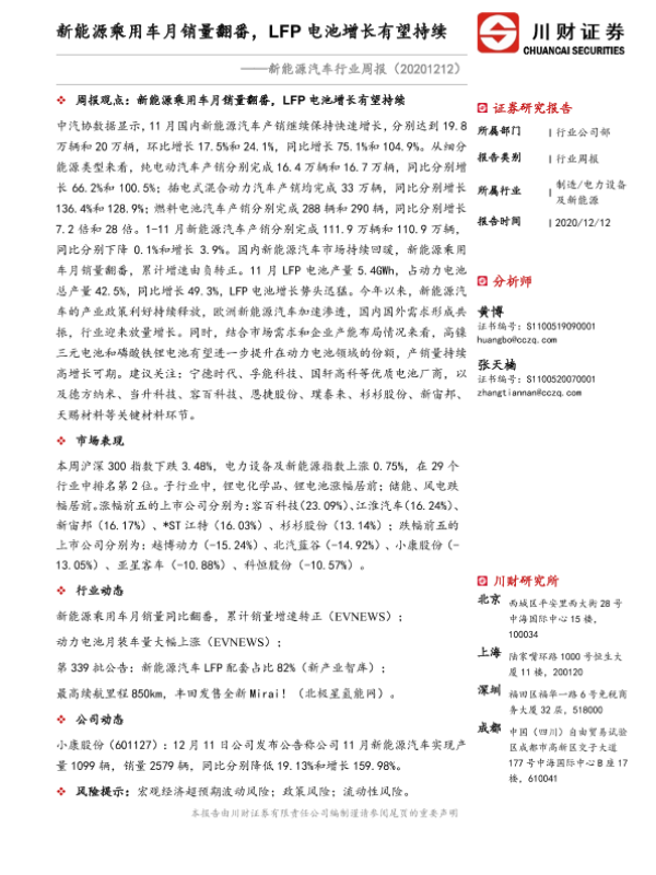 【川财证券】【20201212】新能源汽车行业周报:新能源乘用车月销量翻番,LFP电池增长有望持续-20页