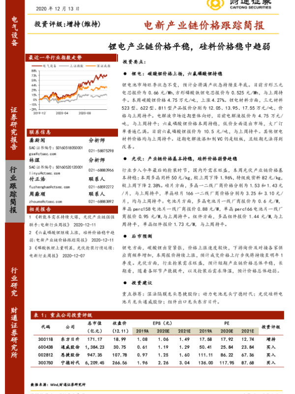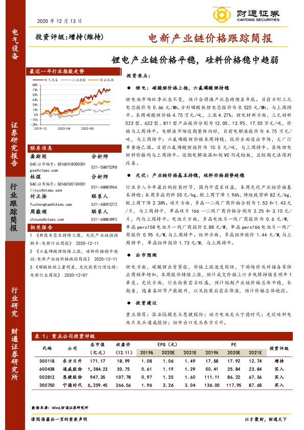 【财通证券】【20201213】电新产业链价格跟踪简报:锂电产业链价格平稳,硅料价格稳中趋弱-11页