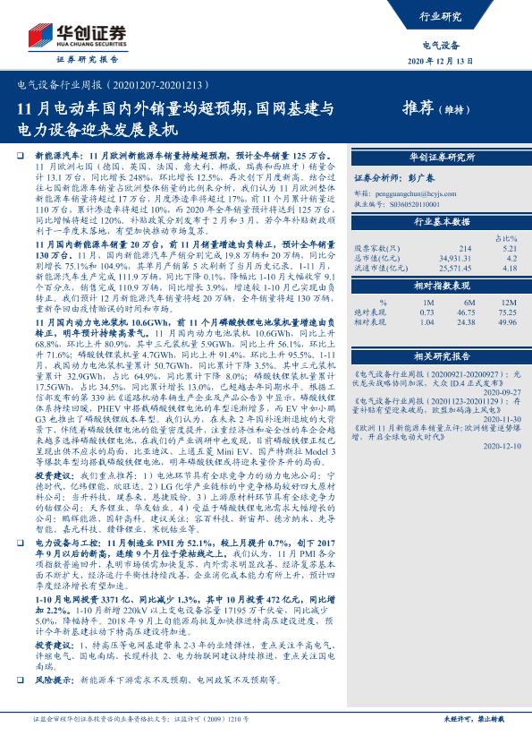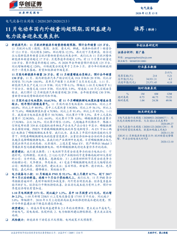【华创证券】【20201213】电气设备行业周报:11月电动车国内外销量均超预期,国网基建与电力设备迎来发展良机-12页