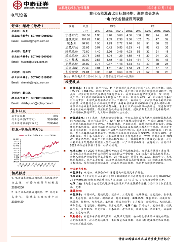 【中泰证券】【20201213】电力设备新能源周观察:非化石能源占比目标超预期,聚焦成长龙头-20页