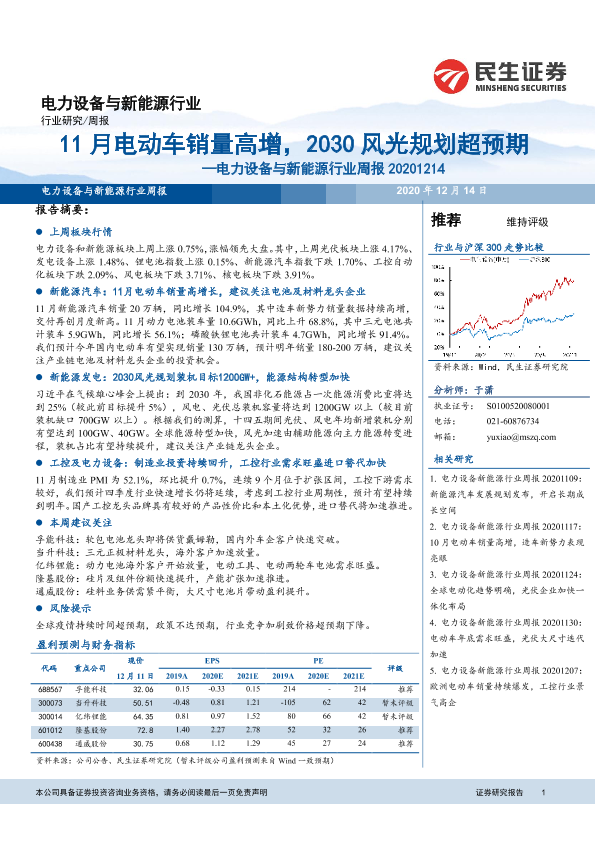 【民生证券】【20201214】电力设备与新能源行业周报:11月电动车销量高增,2030风光规划超预期-17页