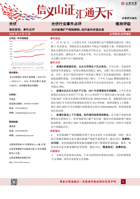 【山西证券】【20201217】光伏行业事件点评:光伏玻璃扩产限制解除,组件盈利有望改善-2页