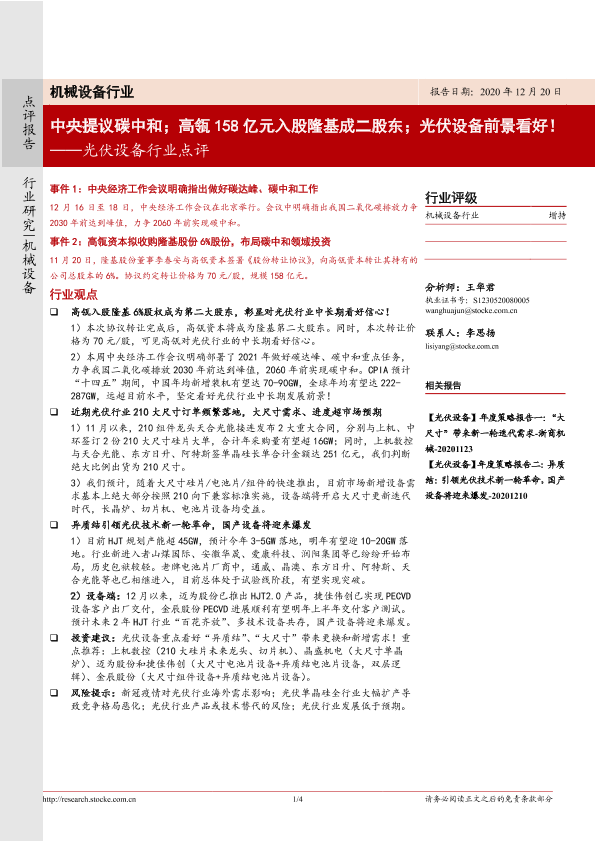【浙商证券】【20201220】20201220-浙商证券-光伏设备行业点评:中央提议碳中和;高瓴158亿元入股隆基成二股东;光伏设备前景看好!-4页