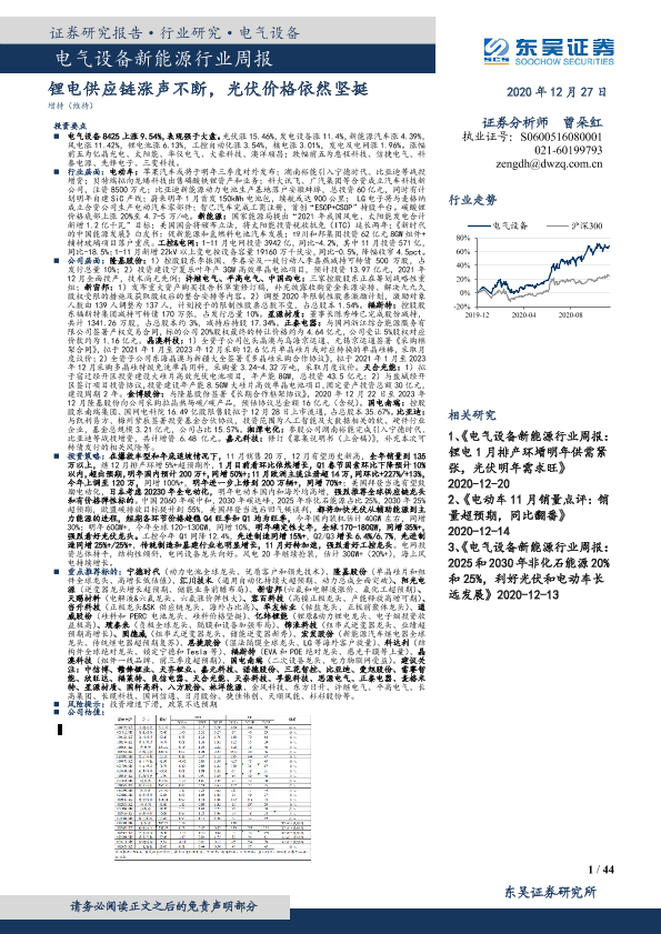 【东吴证券】【20201227】电气设备新能源行业周报:锂电供应链涨声不断,光伏价格依然坚挺-44页