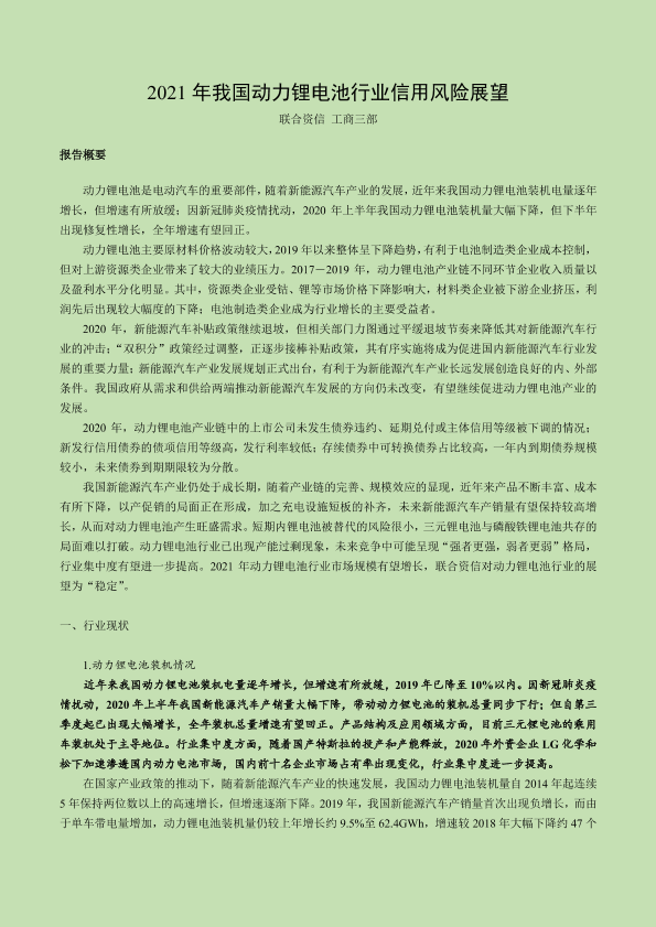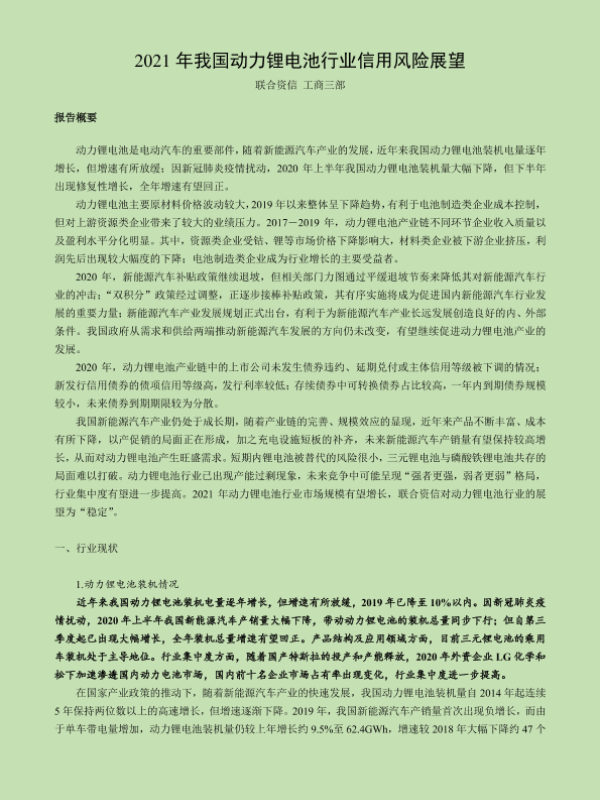 【联合资信】【20201230】2021年我国动力锂电池行业信用风险展望-10页