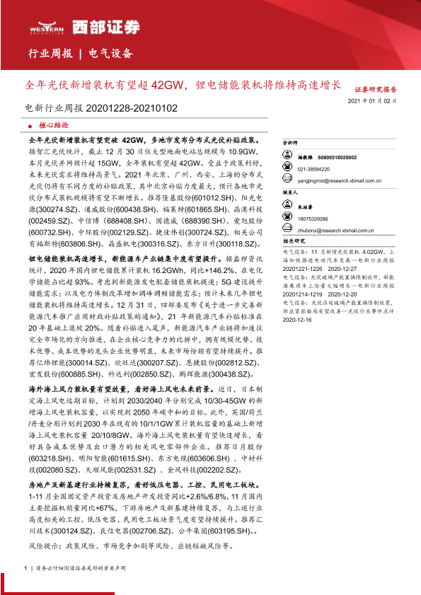 【西部证券】【20210102】20210102-西部证券-电新行业周报:全年光伏新增装机有望超42GW,锂电储能装机将维持高速增长-12页