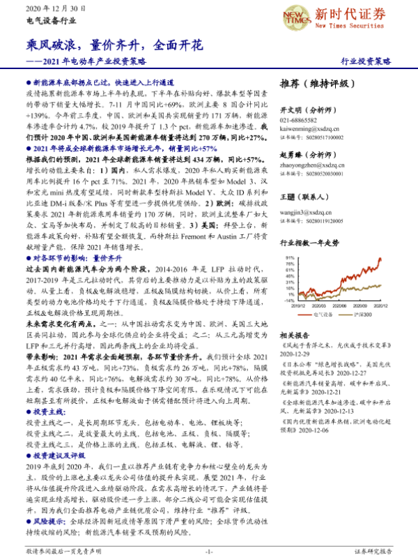 【新时代证券】【20201230】电气设备行业2021年电动车产业投资策略:乘风破浪,量价齐升,全面开花-34页