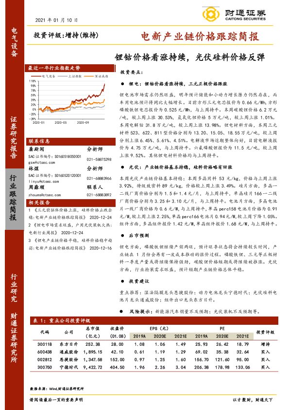 【财通证券】【20210110】电新产业链价格跟踪简报:锂钴价格看涨持续,光伏硅料价格反弹-11页
