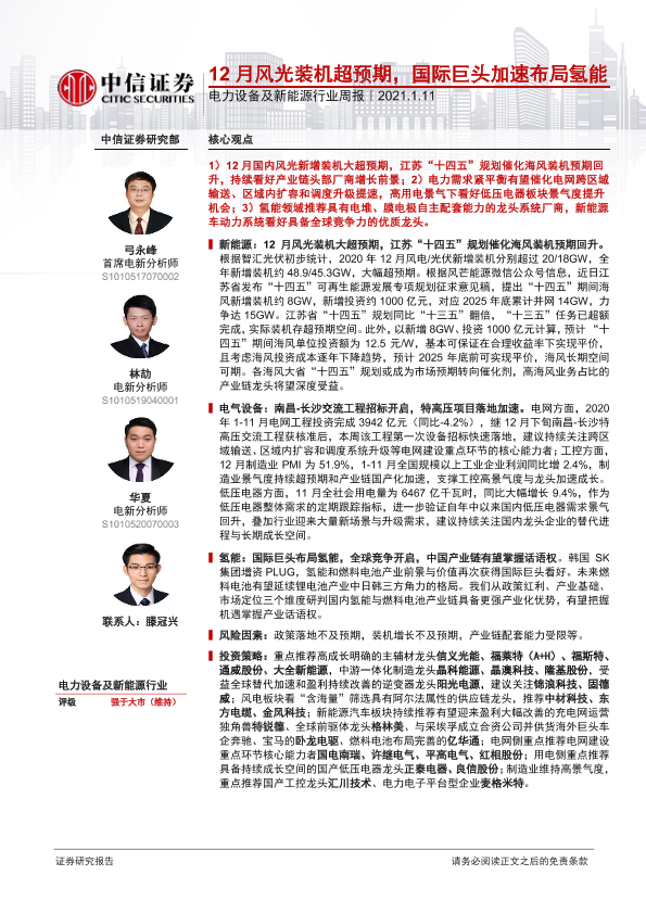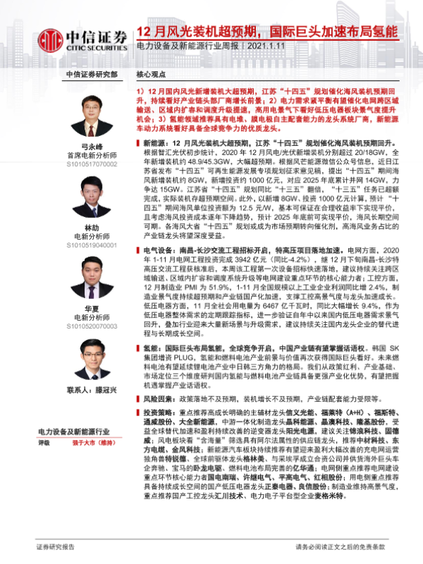 【中信证券】【20210111】电力设备及新能源行业周报:12月风光装机超预期,国际巨头加速布局氢能-13页