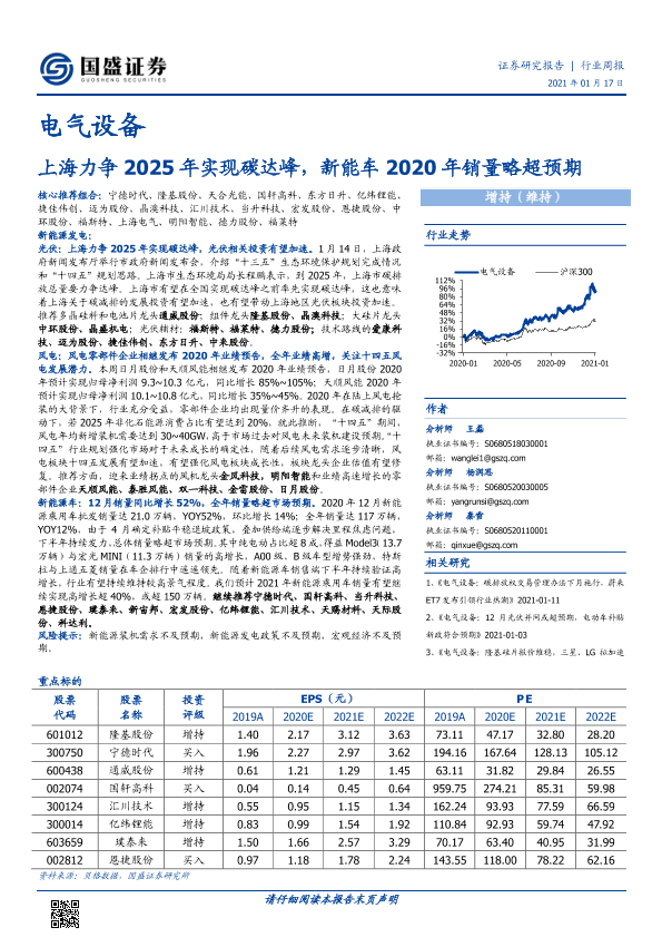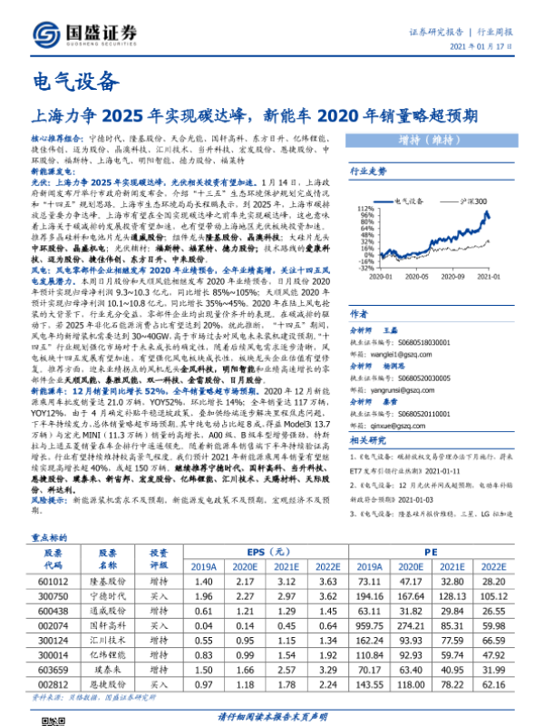 【国盛证券】【20210117】电气设备行业周报:上海力争2025年实现碳达峰,新能车2020年销量略超预期-14页