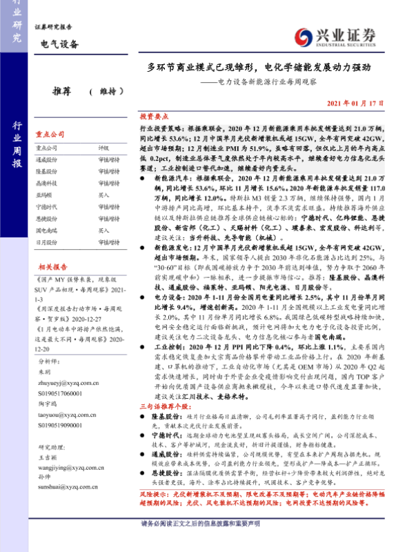 【兴业证券】【20210117】多环节商业模式已现雏形,电化学储能发展动力强劲——电力设备新能源行业每周观察-32页