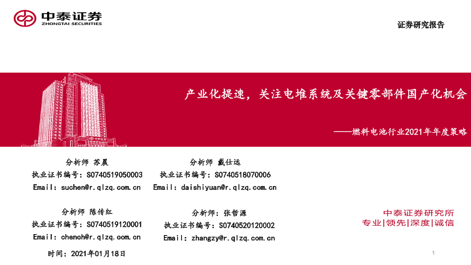 【中泰证券】【20210118】燃料电池行业2021年年度策略:产业化提速,关注电堆系统及关键零部件国产化机会-45页