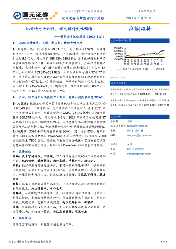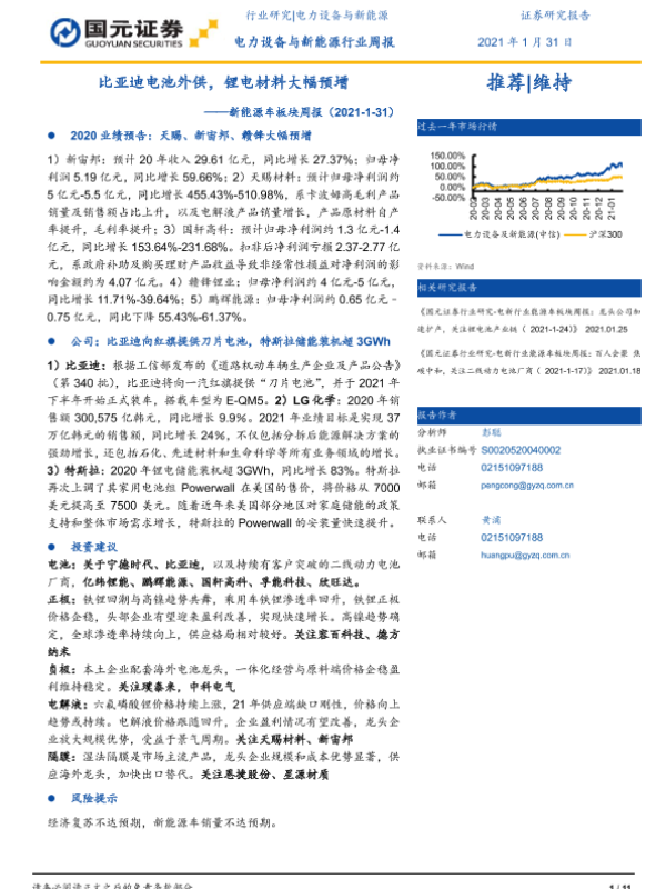 【国元证券】【20210131】新能源车板块周报:比亚迪电池外供,锂电材料大幅预增-11页