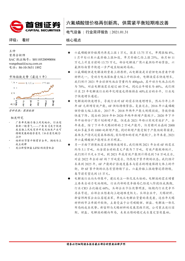 【首创证券】【20210131】六氟磷酸锂价格再创新高,供需紧平衡短期难改善-16页