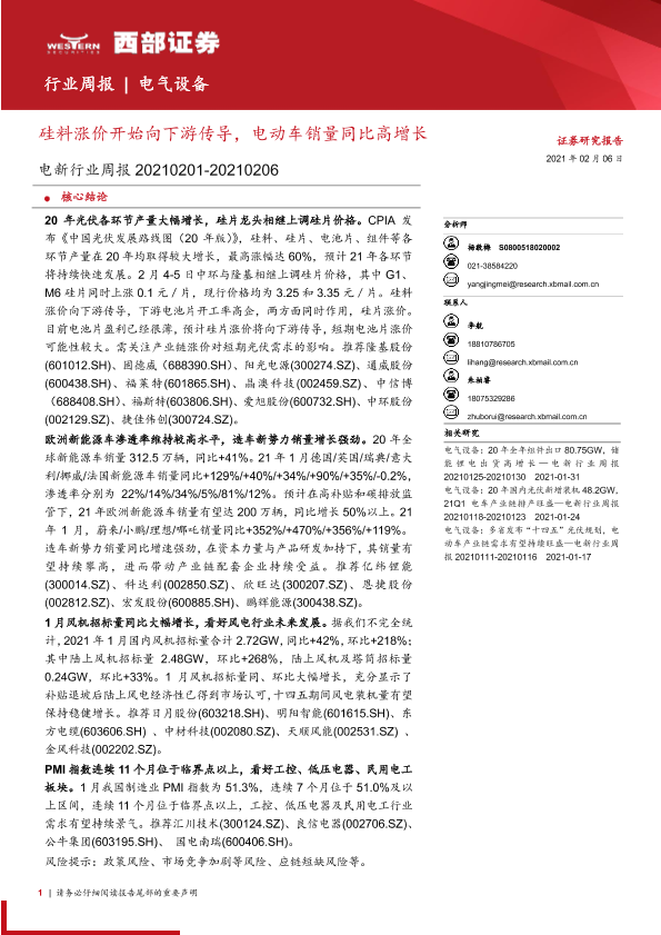 【西部证券】【20210206】电新行业周报:硅料涨价开始向下游传导,电动车销量同比高增长-12页